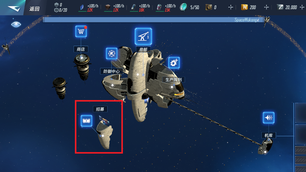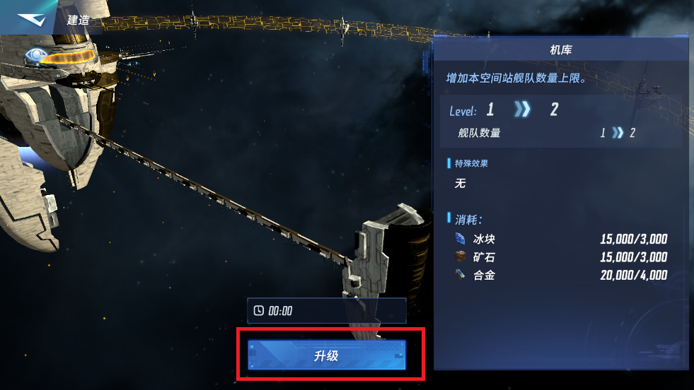 4、首先升级机库,后续可以根据需要自由选择其他建筑进行建设,升级机库需要消耗资源。