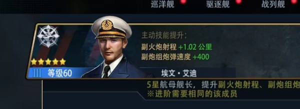 指挥官也就需要选卢金斯,这个指挥官可以提升副炮射程2公里、暴伤5%,中将后副炮组伤害加两百、暴击加5%。可惜卢金斯的主动技能航母无效,不然突击者的副炮射程更远,不过在游戏中点两下卢金斯的头像(主动技能齐射模式)你可以发现一件神奇的事——副炮炮速稍微快了点(需把卢金斯升至上尉以后)。