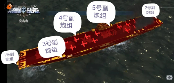 说完突击者的配置,再来说下突击者的“姿势”,玩家如何摆好突击者“姿势”便决定玩家能否让副炮输出最大的伤害。它的五个副炮组,各控制40门副炮分布在船的前中后各个地方,其中一号和二号副炮组各控制一个副炮,三号和四号副炮组各控制18门副炮,五号副炮组控制两门副炮。这样的分布让突击者像一只刺猬,只要有敌人靠近刺猬的刺立马直起来发起攻击防御。
