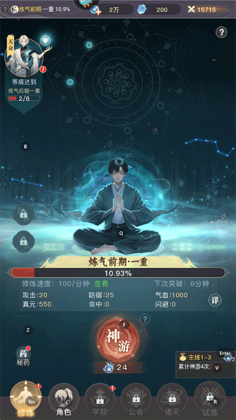 3、境界突破,提升至炼气前期一重,同时解锁宝具栏;