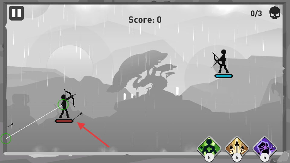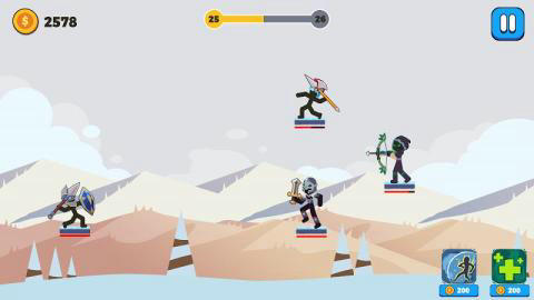 2、战斗时滑动屏幕调整瞄准角度,控制火柴人射箭,借弹道轨迹精准打击敌人得分。
