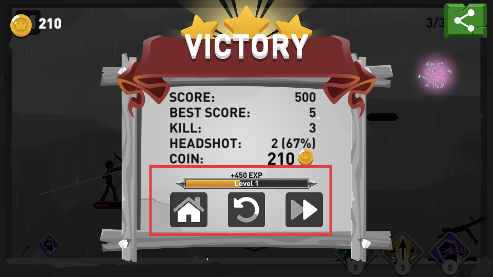 4、通关后可选择主页、重玩或下一关,积累【210】金币与经验,强化角色弓箭挑战高难。