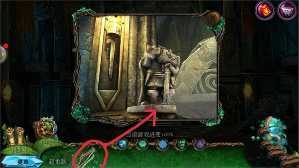 8、点击左边的齿轮,用【钳子】剪断铁丝;清理掉所有卡住轮子的废弃物;先找到【锯子】锯掉木棍;再找到【钩子】钩树叶里的【锥子】;把【锥子】放在石头堆里,最后用【锤子】敲打,移开石堆;完成游戏,拿到【起重器】。