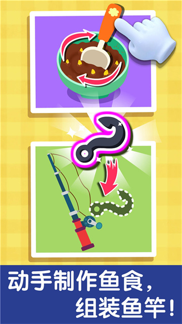 1、完整钓鱼流程模拟,从制作鱼饵到组装鱼竿,通过搅拌饵料、安装鱼漂等步骤,让孩子理解钓鱼的完整流程,锻炼手部精细动作。