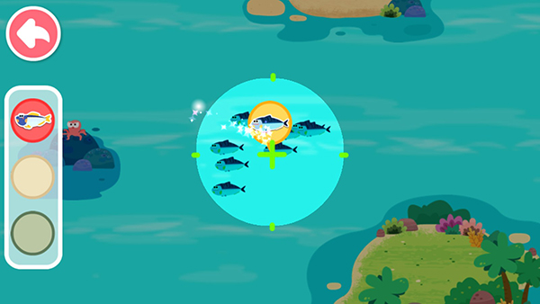 2、海洋生物认知系统,游戏包含20余种特色鱼类,点击交互即可听取标准名称发音,帮助幼儿建立基础海洋生物图鉴认知体系。