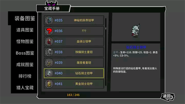 点评:重铠中属性中最均衡的铠甲,最重要的是钻石骑士铠甲并没有附加属性条件,玩家持有任何一把武器都可以享受全部的属性加成。