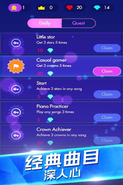 钢琴独奏大师是一款很好玩的音乐节奏手机游戏。在游戏内需要你跟随着白键进行点击的,只需滑动就可以演奏不同的音乐的,游戏是十分考验玩家的手速的。操作过程是十分流畅的,即便是离线也可以参与的。游戏的画风是采用竖版的,此外也还加入了很多动听的钢琴曲的。游戏还有着很多的模式的,不仅可以自己单独参与,还可以和好友们一起联机参与畅玩的。想参与就赶紧点击它下载吧。