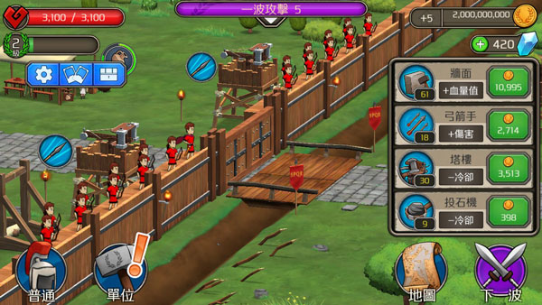 3、消灭敌人进宫后,便可获取大量游戏奖励,通过消耗这些奖励可以提升你的城防防御,并且还能升级你的士兵。