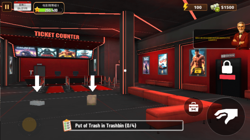 可能会有人想要打扰电影院的安宁!识别并干预吸烟者和秘密录制影片的人。要迅速,否则其他顾客可能会因不满而离开。通过掌掴来维护秩序,确保所有顾客都满意!