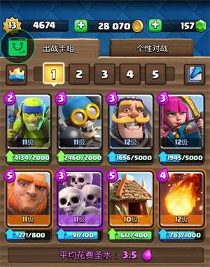 卡组:骷髅海+巨人+骑士+火球+哥布林小屋+火枪手+炸弹人+哥布林投矛手