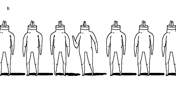 当那个人爬起来后,会走在一个队列之中,似乎在告诉我们它试图在融合进社会这个大群体中,挨个人往右点击即可完成这个画面。