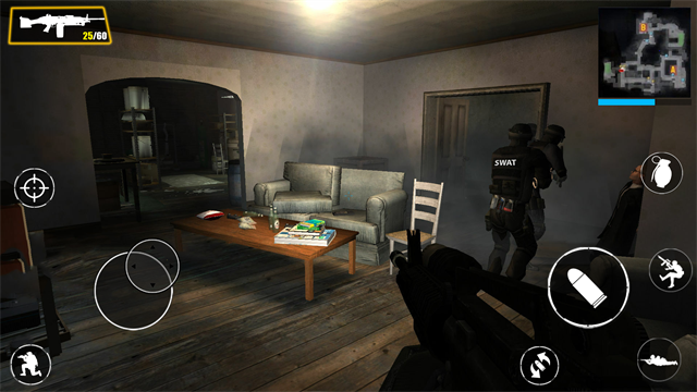 “在离线特警游戏中玩战斗”: 强调了其特警模拟的侧面,任务可能包括解救人质、拆除炸弹、秘密潜入等经典反恐桥段。