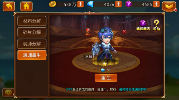 游戏加入了英雄商店等特定商店,我们可以在其中用英雄粉尘购买想要得到的英雄碎片。而英雄碎片的获得,除了副本奖励和成就系统之外,其中最为方便的方式就是重生天使了。在重生天使功能中,游戏主要将它分为了四个小模块: