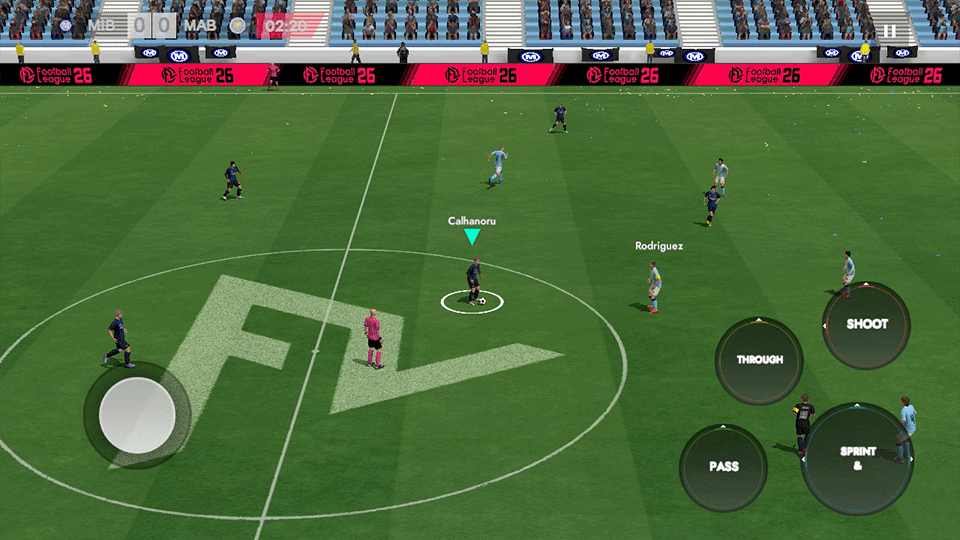 6、比赛中通过左下角虚拟摇杆操控球员移动,右侧按钮可完成传球、冲刺、射门等操作。充分运用技巧与配合,为你的球队赢得荣耀与胜利吧!