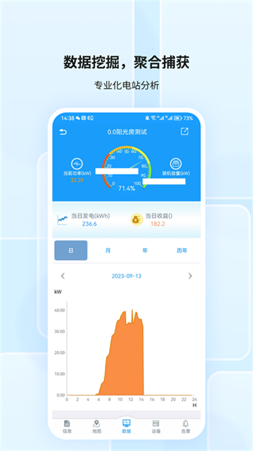 护光者是一款相当专业的光伏电站管理工具,致力于为用户提供一站式的电站监控和操作解决方案。有了这个APP在手机上就能实时查看电站的发电状态,任何故障都能第一时间知悉。护光者提供了多个版本,在Android手机、平板以及电脑PC端上都能用,很好地满足用户在不同场景环境中的需求,而且还有云端备份和数据同步功能,既能节省用户的设备内存,还能防止数据意外丢失。此外,在APP中还可以随时随地调取历史记录,相当高效快捷,让电站管理效率大幅提升。