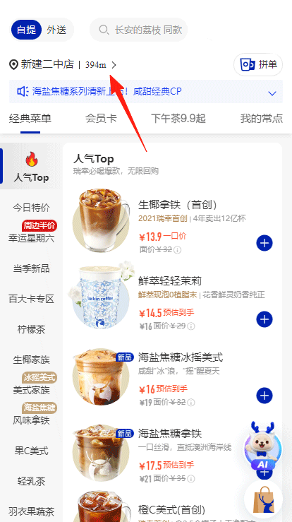 1、打开瑞幸咖啡APP,首页提供了 外卖 配送和到店自取,这里以到店自取为例;