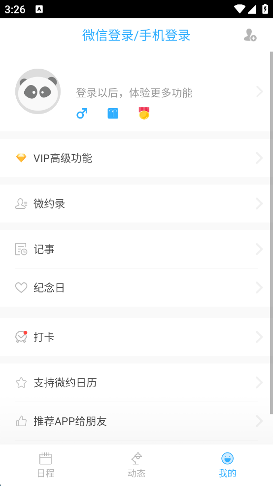 3、在【我的】页面里可以使用记事/纪念日/打卡/微约录等功能