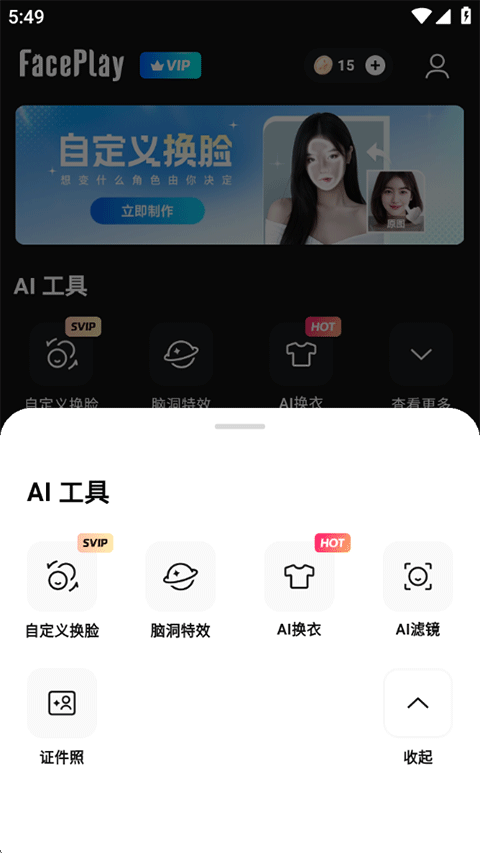 1、自定义换脸:功能升级强势回归!有了它,你想变什么角色都可以!影视剧主角、cosplay、长腿御姐、纯欲甜妹、国风旗袍……甚至可以跟你的爱豆拍一张甜甜的合照~如此酷炫好玩的神器,还等什么?快来体验,开启奇幻换脸之旅吧!