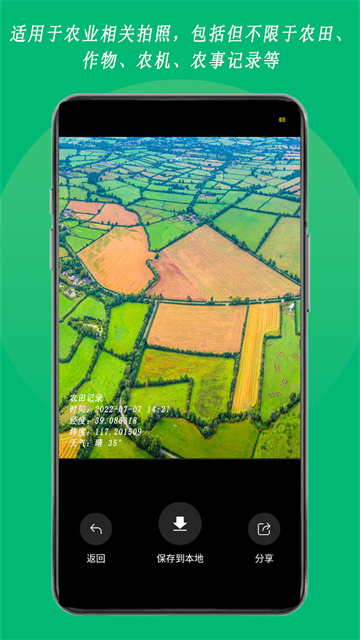 4、【适用场景广泛】农用相机适用于农业相关拍照,包括但不限于农田、作物、农机、农事记录等,适用于农业巡查、勘察取证、外勤拍照、工程管理等;拍照片,防篡改,好用的拍照APP,农业工作者共同的选择。