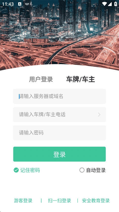 1、打开易查车APP,在登录首页-用户登录,输入服务器或域名,账号和密码,点击登录;