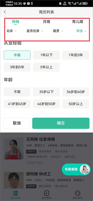2、进入后在简历列表中选择保姆、月嫂或者 育儿 嫂,并在下方筛选栏目中选择你的标准