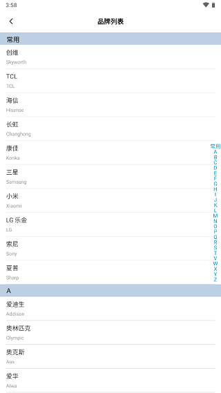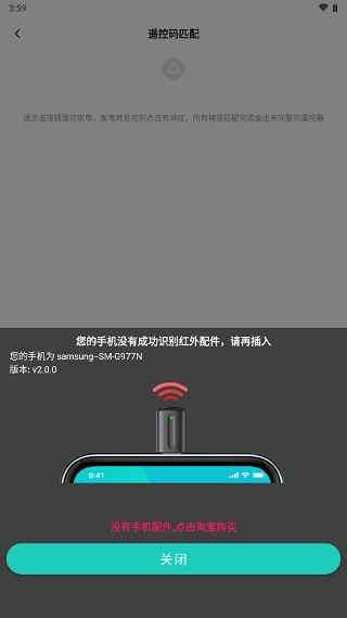 2、如果产品指示灯有亮,则请选择正确的家电类型和品牌进行匹配,如果不行,可更换搜索型号查找(型号一般在家电的产品铭牌上面有)。如果还是不行,则可能是我们app码库没有,请反馈给我们,并试用其他家电遥控。