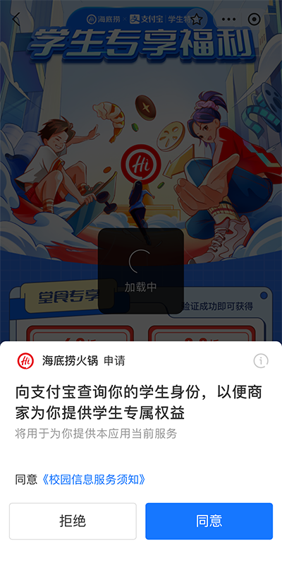 1、首先用户需要打开支付宝,搜索“海底捞”小程序,点击进入高校学生验证专享
